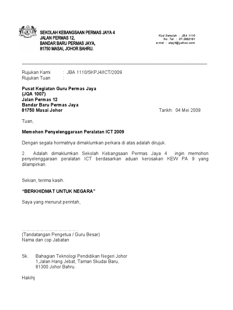 Tarikh yang dinyatakan adalah tarikh rasmi. Feb 12, 2020 · contoh surat permintaan barang yang baik dan benar akan berisikan secara detail isi dan maksud dari surat tersebut yakni mengenai sebuah permintaan barang lengkap dengan harga dan rincianya sehingga sangat mudah untuk di pahami kepada siapa kita akan mengirim surat, juga haruslah jelas dan bisa di baca dengan sistem bahasa yang baku dan sopan. Surat permohonan berisi tentang sebuah permintaan tentang sesuatu hal kepada pihak yang bersangkutan, perseorangan, badan atau lembaga, organisasi, perusahaan atau instansi dan lainnya. Untuk itu, contoh surat permohonan dukungan material sangat. Kepada yth, aksara jaya abadi.